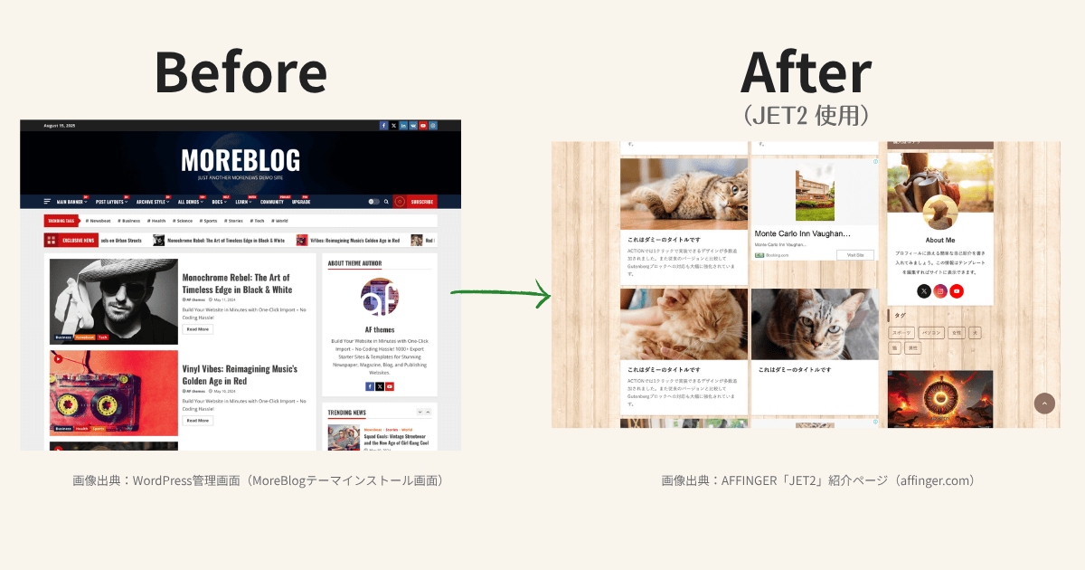 有料テーマ(AFFINGER)がデザインのベースで、JET2がAFFINGER専用の着せ替えデザイン、みたいな感じです。(伝われ..🥺)